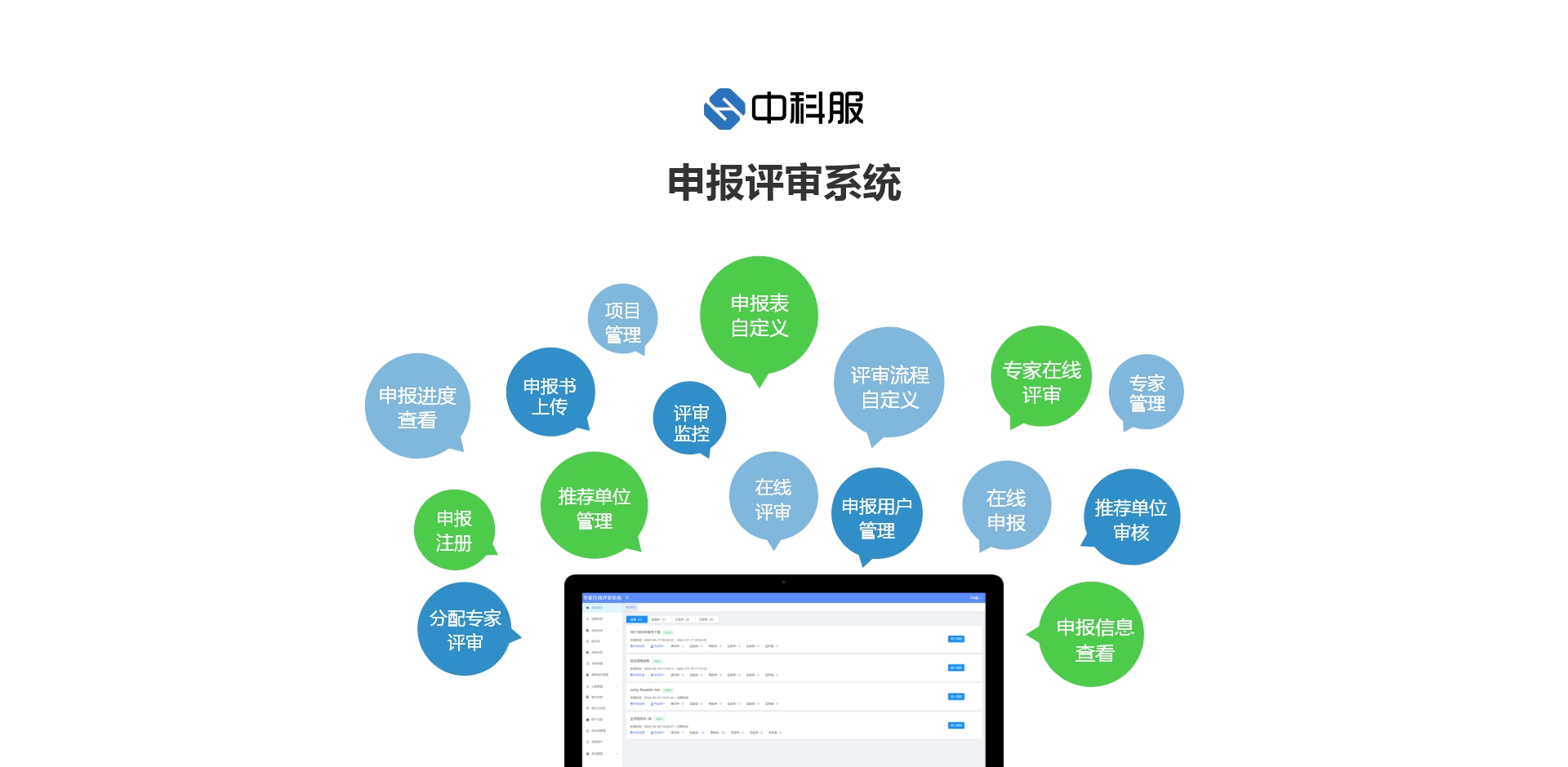 申报评审系统通过流程再造与数字技术深度融合,重构传统审批模式。中科服申报系统作为典型应用,以“智能协同、数据驱动”为核心,形成六大功能体系,显著提升审批效率(平均缩短审批周期60%以上)。以下是具体功能解析: